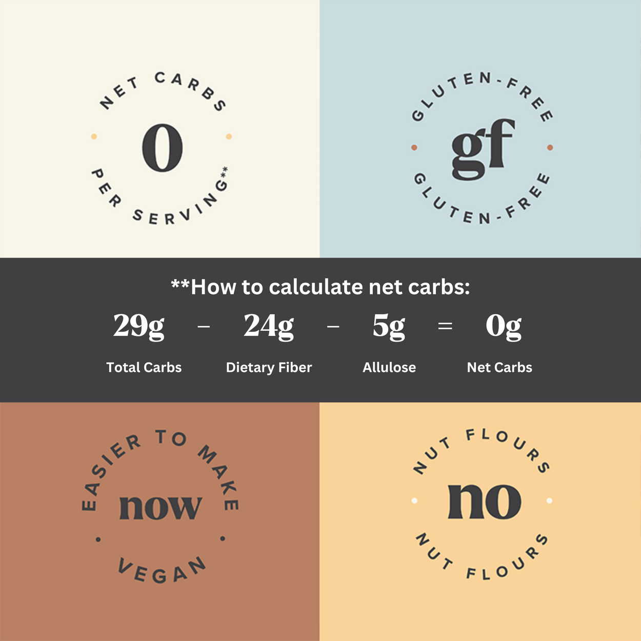 Resistant tapioca starch, allulose, chicory inulin, flax seeds, psyllium husk, baking powder (sodium bicarbonate, monocalcium phosphate, sodium acid pyrophosphate), modified cellulose, salt.