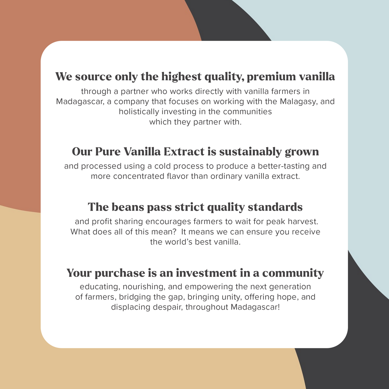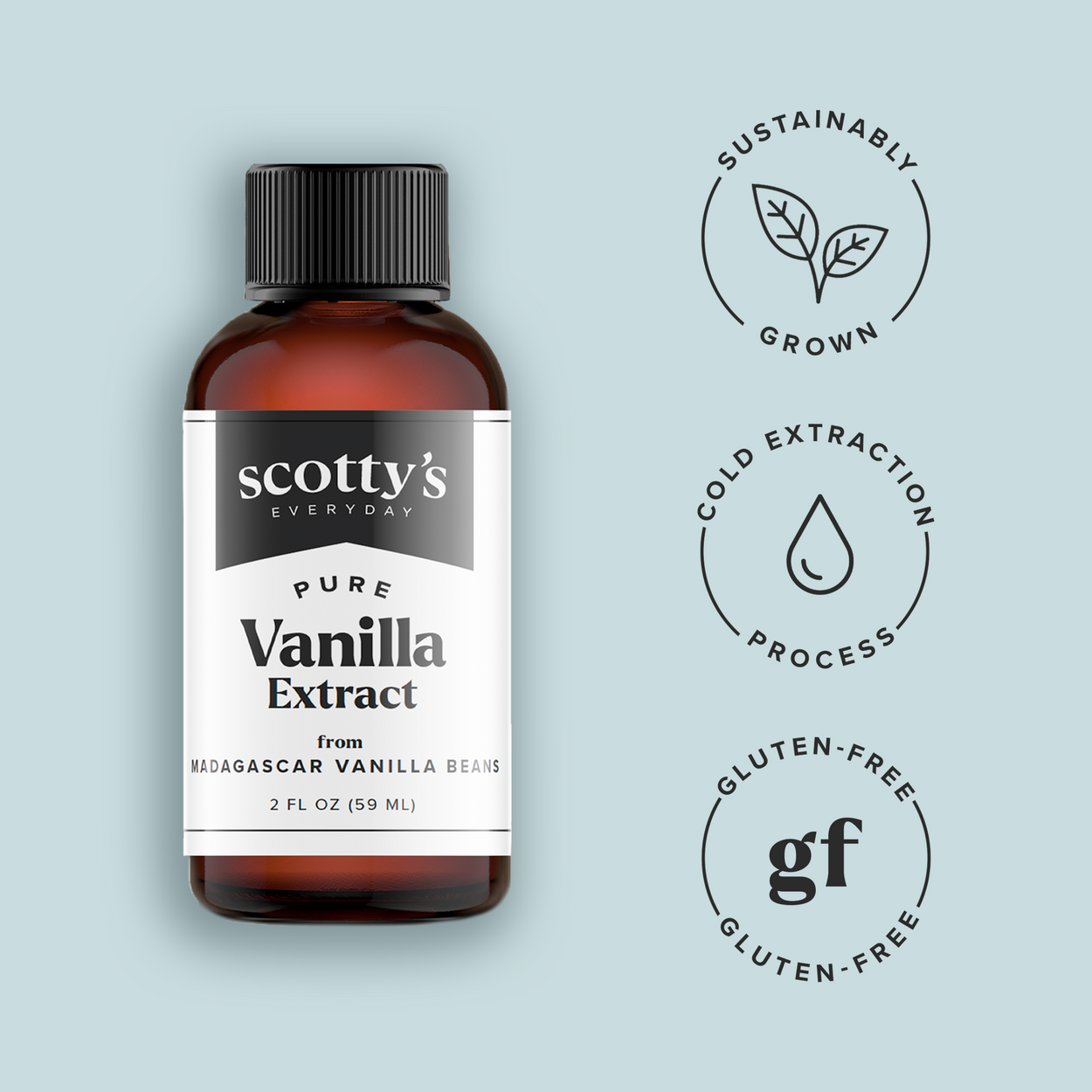 Scotty's Everyday Pure Vanilla Extract is made with sustainably sourced and grown Madagascar beans. The vanilla beans are allowed to go to the peak of harvest, and are then processed using a cold process. This means you will get an extract that is more concentrated, and better tasting than ordinary vanilla extract.